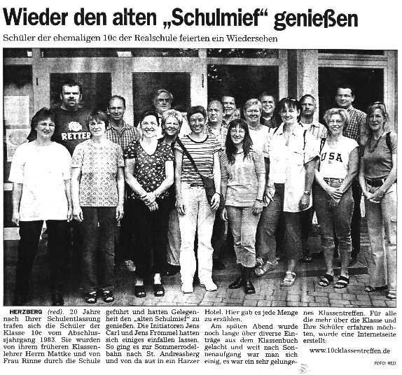 Vom 14.-15. Juni war es nun soweit. Unser 20 jähriges Klassentreffen fand statt. Nachdem wir ein wenig alten "Schulmief" geschnuppert hatten, ging es nach St. Andreasberg. Kaum angekommen, stellte sich die Frage: Wo ist Hattorf geblieben? Verfahren?? Mhhh.. keiner wusste so genau, Handy??? wer hat ne Nummer??? Aber nach kurzer Zeit sind sie dann doch noch angekommen. Heike hat sich nicht wohl gefühlt und in Bad Lauterberg raussetzen lassen. Nun alle zusammen (bis auf 2 Ausnahmen) mit der Seilbahn auf den Berg hinauf und in der Matthiasbaude etwas gegen den Durst getan. Als es dann dunkler wurde und die ersten Regentropfen vielen ging es bergab mit dem Sommerrodel. Für Jens C. war die Fahrt etwas schmerzhafter, na ja man sollte auch nicht mit dem Ellenbogen bremsen!! Gutgelaunt ging es dann in das Hotel Rehberg, wo es erst einmal die Zimmer zu verteilen gab. Im Gastraum wurde nun auch ein PC aufgebaut, damit alle ohne Computer zuhause, auch einen Blick auf die Klassenhomepage werfen konnten. Nun machten die ersten Biere die Runde und nach dem Essen kamen dann auch die "großen Gerbera"(julischka aus kl. Flaschen 4cl) und Dechen bemerkte schon nach kurzer Zeit: ...die große Gerbera hat`s in sich!!!!! wie spät es dann war weiß ich nicht, aber als ich die Kopien des letzten Klassenbuches auf den Tisch brachte, war die Stimmung riesig. Ich hatte noch versucht einige Einträge über mich zu überspringen, ...vergebens, es mußte alles vorgelesen werden. Am späten Abend, (oder war es schon früh?) ging es dann noch in einen "Indischen Tanztempel" ohne DJ und ohne CD´s.(die ham´se mir gestern geklaut!) Die Musik haben wir dann selbst versucht aufzulegen. Na ja so schlecht kann es nicht gewesen sein, es war nämlich schon sehr hell draußen als wir zum Hotel zurück kamen. Nach zu kurzem Schlaf, gab es dann Frühstück und viel vom Abend zu erzählen. Alle waren sich einig: es war super!!! | |||||||||||||||||||||||||||||||||||||||||||||||||||||||||||||||||||||||||||||||